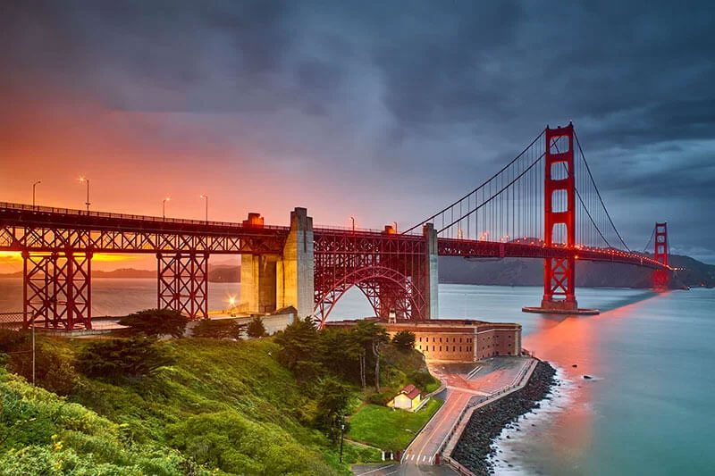 • Cầu Cổng Vàng Golden Gate Bridge, cây cầu treo lớn nhất thế giới được hoàn thành và nó đã trở thành biểu tượng quốc tế được công nhận ở San Francisco và California. Đến đây, Quý khách còn có thể vào công viên cầu cổng vàng để bộ qua những khu vườn xinh xắn như vườn trà Nhật Bản, vườn thực vật, đến khu nhà kính ngắm lan nở và tham quan các viện bảo tàng độc đáo. Với những gì hiện có của công viên Golden Gate, thật khó để tin rằng 1017 mẫu Anh xanh mướt này từng là cồn cát chỉ có bụi rậm.