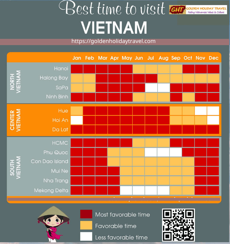 Look at the above chart, we can tell the ideal time to visit different places in Vietnam is between November and April, you can expect pleasant climate & dry weather. In this time, while Northern Vietnam is falling in the winter & spring - pleasantly cool for outdoor activities of long trekking route or biking fun, Southern Vietnam is stunning with dry & sunny days - ideal for beach breaks on plenty of sandy beaches in Phu Quoc islands, Mui Ne or Con Dao islands.