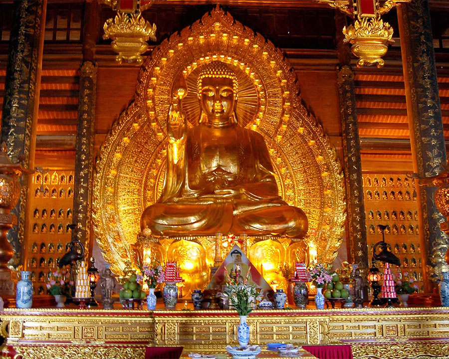 10h30: Tới Bái Đính. Hướng dẫn viên đưa Quý khách vào thăm chùa Bái Đính - ngôi chùa nổi tiếng với nhiều kỷ lục: Khuôn viên cả khu chùa Bái Đính có diện tích 107ha, trong đó, Điện thờ Tam Thế và Pháp Chủ rộng hàng ngàn mét vuông; tại ngôi chùa này có tượng Phật Tổ Như Lai bằng đồng lớn nhất Đông Nam Á (nặng 100 tấn) và ba pho tượng Tam Thế, mỗi pho nặng 50 tấn.