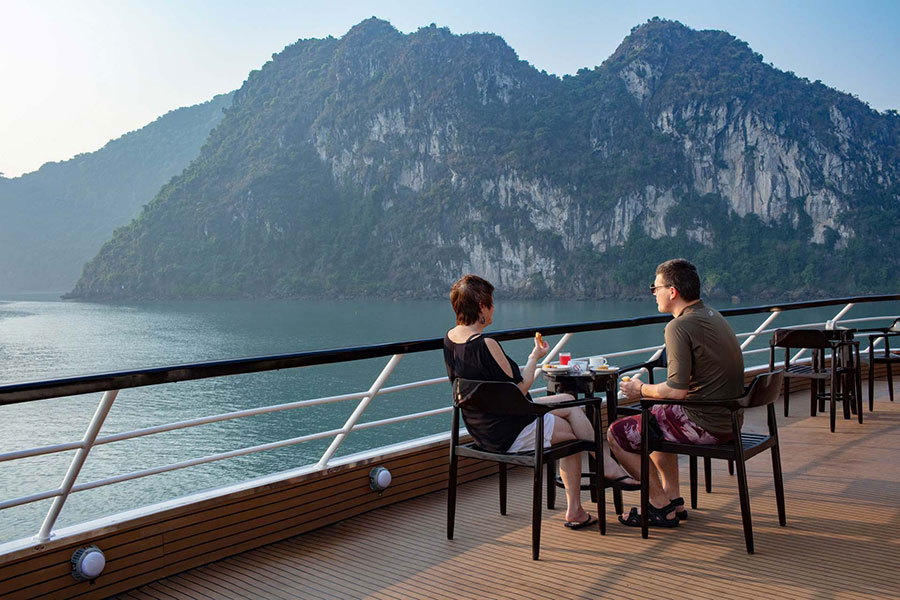 6h00: Quý khách sẽ bắt đầu ngày mới với không khí trong lành của biển cả, tham gia tập Taichi cùng với nhân viên trên tàu hay chào đón bình minh từ cửa sổ trong phòng của Quý khách. Bữa sáng nhẹ sẽ được phục vụ trong khoảng thời gian từ 06:30 đến 07:30.