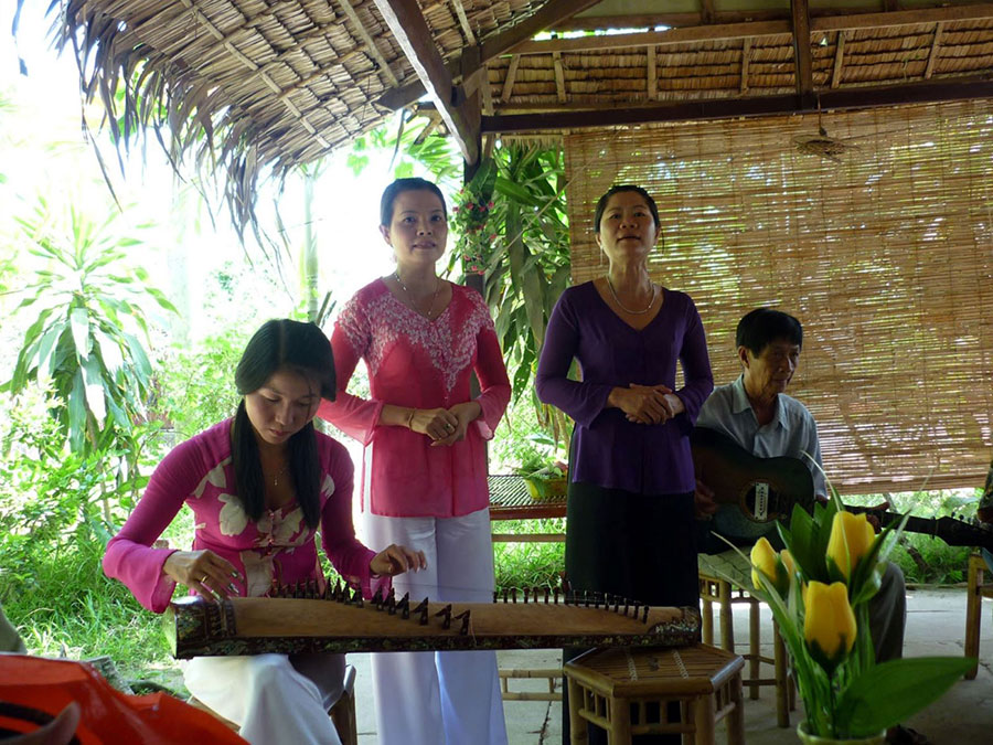 Walk continuously in the village to the fruit orchard. Have a taste of the seasonal tropical fruit and enjoy the traditional Southern Vietnamese music performance (Don Ca Tai Tu).