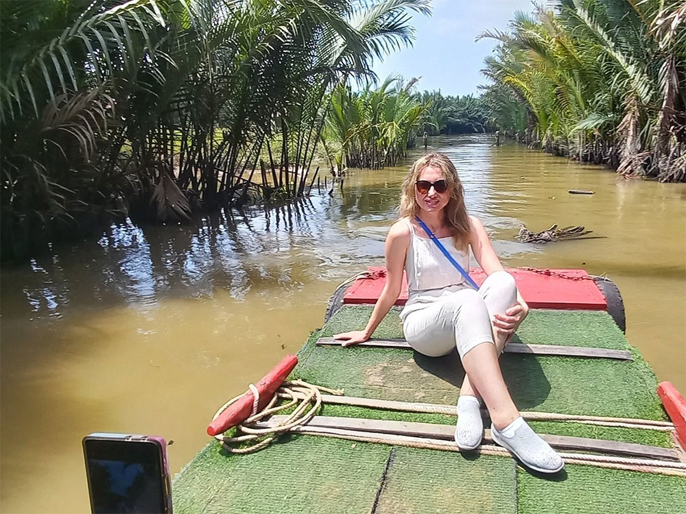 Continue short walking to visit farmer house who making sleep mats.Cycle rural tracks or drive tuktuk through coconut grove, vegetable plains (cucumber, bitter melon...). Keep going by rowing boat on shady palm tree canal and stop for lunch at riverside restaurant. Boating back Hung Vuong pier by motorboat. In the late afternoon, you will come back city then check in hotel and free at leisure.